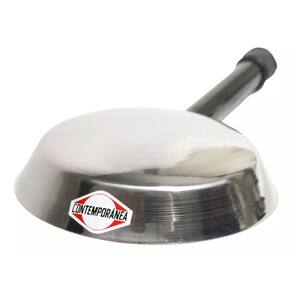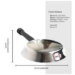 Frigideira Luxo da Contemporânea, produzida em aço inox, com espessura grossa, é um instrumento durável. Desenvolvida com fundo abaulado, facilitando muito nas manobras de girar a frigideira. O cabo é soldado ao corpo, então tem melhor timbre e durabilidade do que se fosse parafusado.