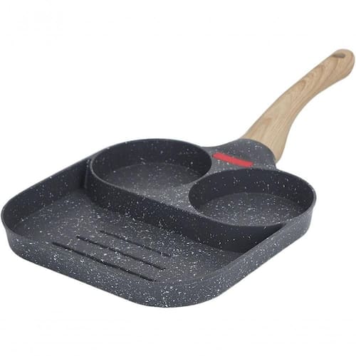 - Linha: Frigideira antiaderente com três divisórias circulares.