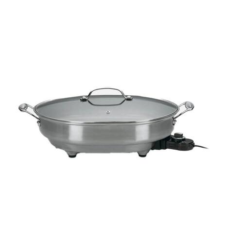 A frigideira elétrica Cuisinart® de aço inoxidável escovado é um dos aparelhos de cozinha de bancada mais versáteis do mercado e uma adição valiosa a qualquer cozinha. Uma sonda de temperatura se ajusta de quente para 450° F e pode ser removida para tornar a frigideira lavável na máquina de lavar louça. A superfície de cozimento antiaderente é ideal para cozinhar com baixo teor de gordura ou sem gordura e é grande o suficiente para pedidos familiares de panquecas ou uma fajita com amigos.