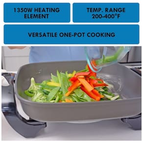 COZINHA VERSÁTIL: A Frigideira Elétrica Kenmore é perfeita para uma variedade de necessidades culinárias, do café da manhã ao jantar. Ideal para preparar refeições favoritas. Sua versatilidade a torna uma adição prática a qualquer cozinha, permitindo cozinhar diferentes tipos de alimentos com facilidade. FÁCIL DE LIMPAR: O design da Frigideira Elétrica Kenmore a torna incrivelmente fácil de limpar, o que é uma grande vantagem para uso diário. Requer pouco óleo, reduzindo o esforço necessário para mantê-la. A superfície antiaderente garante que resíduos de alimentos não grudem, permitindo uma limpeza rápida e eficiente. ACABAMENTO ANTIADERENTE: O revestimento antiaderente na Frigideira Elétrica Kenmore é altamente eficaz, garantindo que os alimentos não grudem durante o cozimento. Isso torna tanto o cozimento quanto a limpeza muito mais fáceis. TAMANHO COMPACTO: Leve e compacta, a Frigideira Elétrica Kenmore é ideal para cozinhas pequenas e fácil de armazenar. Seu tamanho é perfeito para cozinhar refeições para uma família pequena e se encaixa convenientemente em um armário quando não está em uso. TOTALMENTE IMERSÍVEL PARA UMA LIMPEZA SEM ESFORÇO: Esta Frigideira Elétrica Kenmore é totalmente imersível, permitindo lavar a base e a tampa rapidamente e facilmente à mão. COZIMENTO VERSÁTIL EM UM ÚNICO RECIPIENTE: Com laterais altas e uma tampa de vidro ventilada, a Frigideira Elétrica Kenmore pode ser usada para cozinhar de panquecas a guisados. ALIMENTAÇÃO DE 1350W: O potente elemento de aquecimento de 1350 watts da Frigideira Elétrica Kenmore aquece de forma eficiente e uniforme toda a superfície de cozimento, garantindo um cozimento rápido e consistente. CONTROLE DE TEMPERATURA AJUSTÁVEL: O simples mostrador de controle de temperatura permite aos usuários personalizar a temperatura de cozimento de "Aquecer" a 204°C. DESIGN COMPACTO E PORTÁTIL: O design versátil e economizador de espaço da Frigideira Elétrica Kenmore permite substituir panelas e frigideiras. Pode ser utilizado em qualquer lugar com fonte de energia, sendo ideal para espaços pequenos como dormitórios, chalés, trailers ou motorhomes.