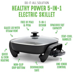 Se você procura por uma cozinha completa que pode ser apenas conectada, não procure mais. Com a Frigideira Elétrica 5 em 1 GreenLife, você pode fritar, refogar, assar, grelhar, cozinhar no vapor e muito mais. Nosso revestimento antiaderente cerâmico saudável foi especialmente projetado para aparelhos de cozinha, proporcionando um desempenho antiaderente ideal. Além disso, nosso revestimento é livre de PFAS, PFOA, grafite e cádmio, permitindo que você cozinhe de forma mais saudável. Com capacidade de 4,7 Litros e área de superfície de 30,48 x 30,48 cm, você tem espaço suficiente para porções grandes que toda a família pode desfrutar, desde grandes lotes de panquecas e ovos de manhã até deliciosas lasanhas e filés de frango à noite. O controle de um botão permite ajustar a temperatura desejada para resultados perfeitos, enquanto os cabos frios ao toque e a base antiderrapante mantêm você confortável e no controle. Além disso, a tampa de vidro temperado mantém o calor, a umidade e o sabor enquanto você acompanha o progresso das refeições. Basta limpar a frigideira quando terminar ou colocá-la na lava-louças para sujeiras difíceis. Não perca a chance de ter uma cozinha saudável e funcional com a GreenLife!