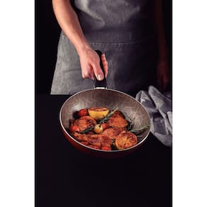 Para preparar suas receitas do dia a dia com muito mais praticidade, conte com a frigideira funda Tramontina Paris em alumínio com revestimento interno e externo em antiaderente Starflon Max vermelho 24 centímetros 2, 2 litros. É produzida em alumínio com espessura de 2, 3 milímetros com revestimento interno e externo de antiaderente Starflon Max, características que juntas, proporcionam um cozimento rápido e uniforme dos alimentos, evitam que eles grudem em sua superfície e a tornam mais fácil de limpar. Seu cabo é em baquelite antitérmico, material que não aquece e oferece maior segurança e conforto no manuseio. Ela ainda é muito prática e pode ir à máquina de lavar louças, facilitando seus preparos na cozinha!