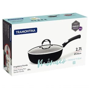 Frigideira Funda Tramontina Mônaco Induction Starflon Premium Preto Com Tampa 24cm A Frigideira Funda Tramontina Mônaco Induction em Alumínio com Revestimento Interno e Externo Antiaderente Starflon Premium Preto com Tampa de Vidro 24 cm de diâmetro 2,7 L é a escolha ideal para garantir o sucesso das suas receitas! Desenvolvida em alumínio com revestimento antiaderente Starflon Premium, características que juntas, evitam que os alimentos grudem em sua superfície, as torna mais durável e não prejudicial à sua saúde. Ela acompanha tampa de vidro temperado com bordas em aço inox e saídas de vapor que facilita o preparo dos alimentos e proporciona a visualização sem a necessidade de abrí-la. Seu cabo é metálico com proteção de silicone e reduz a propagação de calor, aumentando a segurança e melhorando seu manuseio. Além disso, ela possui espessura especial de 3 milímetros, que proporciona o cozimento de maneira uniforme e rápida. Com a Tramontina, você tem os melhores itens para sua cozinha! Recomendações de Uso: A capacidade volumétrica máxima para cozimento é de 3/4 da capacidade total da peça. Posicione os cabos dos utensílios voltados ao centro do fogão.Em fogões com grade, centralize a peça e alinhe o cabo com a grade. Utensílios quentes devem estar fora do alcance das crianças.Este produto não pode sofrer modificações. Antes do primeiro uso, lave com esponja macia, sabão neutro ou detergente líquido. Depois de secar, unte a área interna com óleo ou gordura e leve ao fogo por um ou dois minutos. Deixe esfriar e lave novamente. Seu utensílio Starflon está pronto para uso com ou sem gordura, sempre em fogo baixo ou médio (nunca superior a 350C). Para mexer os alimentos use somente utensílios de silicone, nylon ou madeira. Evite a imersão do utensílio quente em água fria. Nunca utilize produtos abrasivos na lavagem. Se deixar queimar alimentos, umedeça a área e reserve até que possa remover os resíduos grudados com esponja e sabão.Para descarte dos produtos e embalagens siga as orientações de reciclagem vigentes.Este produto não necessita de manutenção, apenas limpeza. Informações Adicionais: