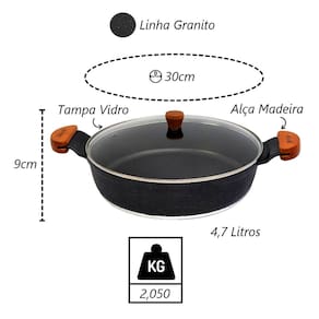 Frigideira Granito Preto Gourmet Antiaderente Javali AM 30cm A frigideira antiaderente, também conhecida como teflon, é revestida com uma substância capaz de repelir certas substâncias. Por isso, a comida não gruda nela. É resistente a altas temperaturas e a arranhões. As frigideiras em alumínio antiaderente contam com uma camada que cobre o seu material e evita que o alimento grude em seu interior. Dessa forma, contribuem para uma culinária saudável, dispensando o uso excessivo de gordura ou óleos vegetais. Para quem gosta de um peixe ou filé de frango grelhado, ou não dispensa uma omelete delicioso, não pode deixar de ter uma em sua cozinha. Manutenção e Dicas:1. Evite grandes mudanças de temperatura. (Levar uma frigideira quente para a água fria pode fazer com que a frigideira deforme.)2. Limpe suas frigideiras antiaderentes com esponjas que não causem riscos.3. Use detergentes mais suaves para limpar suas frigideiras antiaderentes.4. Não use metal na sua frigideira antiaderente.5. Não é ideal para máquina lava louças.6. Evite altas temperaturas de cozimento.7. Não deixe a frigideira vazia no fogo. Especificações Técnicas:Revestimento Externo: Antiaderente Marmorizado Granito.Revestimento Interno: Antiaderente Marmorizado Granito.Alça de Madeira Tampa de Vidro.Litragem: 4,7L.Peso: 2,050Kg.Largura: 30cm.Altura: 9cm. Itens Inclusos:01 Frigideira Granito Preto Gourmet Antiaderente Javali AM 30cm. Código: 2164JAVProdutoLojaPlast.
