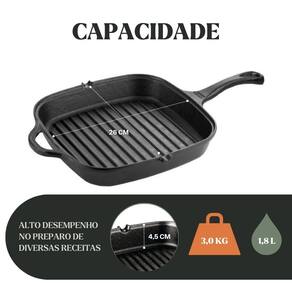Modelo: Frigideira Grill Quadrada Cabo e Alça de Ferro 26×26cm 1,8L Material da peça: ferro fundido Material do cabo: ferro Material da alça: ferro Medidas: 26 × 26 × 4,5cm Capacidade: 1,8 L Peso aproximado: 3,13 kg Compatível com fogão: indução, gás, elétrico, vitrocerâmico, lenha, forno Já vai curado. Pronto para uso Revestimento atóxico (camada protetora) Garantia: 90 dias contra defeitos de fabricação Remover peças de madeira antes de levar ao forno
