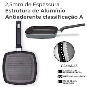 Produzida em alumínio cinza fosco com cabos de baquelite pretos e revestimento cerâmico na cor preta, a frigideira possui a tecnologia Mineral Resist com 6 camadas de antiaderente, sendo 3 de partículas de cerâmica e classificação A do Inmetro, não gruda, é mais fácil de limpar e mais saudável, pois necessita de menos óleo para o cozimento e é livre de PFOA.