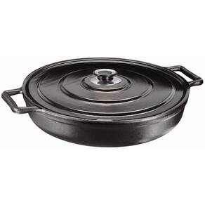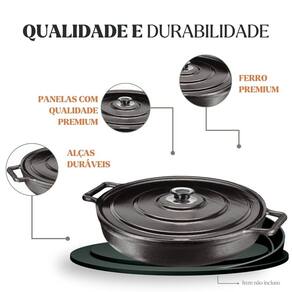 Material da peça: Ferro fundidoMaterial da alça: FerroMaterial da tampa: MetálicaCor: PretaMedidas: 36 × 12 cmCapacidade: 6,4 LPeso aproximado: 7 kgCompatível com fogão: Indução, gás, elétrico, vitrocerâmico, lenha, fornoJá vai curada. Pronta para usoRevestimento atóxico: Camada protetoraGarantia: 90 dias contra defeitos de fabricação