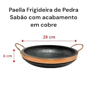 Frigideira de Pedra Sabão A Escolha Perfeita para sua Paella!Que tal preparar uma Paella autêntica com o sabor especial da tradição? Nossa frigideira de pedra sabão é perfeita para esse prato delicioso!- uniforme de calor Cozimento perfeito para arroz, frutos do mar e temperos!- Retenção térmica incrível Mantém a paella quente por mais tempo à mesa.- Material 100% natural Livre de metais pesados e químicos artificiais.- Design rústico e sofisticado Leve do fogão direto para servir com estilo!Duráveis e decorativas as panelas de Pedra Sabão levam charme e requinte para sua cozinha e mesa.CARACTERISTICAS:- Diâmetro: 28 cm- Altura: 6 cm- Peso: 4,800 kgMatéria prima- Pedra Sabão e Cobre O que você achou? Caso tenha ficado alguma dúvida pode nos contatar, teremos o maior prazer em atender.Explore as nossas outras opções de produtos, temos certeza que encontrará outros produtos de seu interesse! :)Visite nossas páginas e nos siga nas redes sociais.