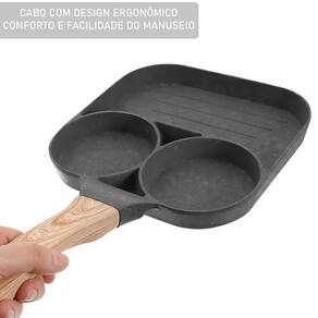 Frigideira Preta Antiaderente 3 em 1 de Alumínio Sem Óleo Descubra uma nova forma de cozinhar com mais praticidade e eficiência. Diferente das frigideiras comuns que exigem tempo e atenção redobrada para preparar cada alimento, nossa frigideira antiaderente com três divisórias revoluciona sua experiência na cozinha. Agora, você pode fritar ovos, hambúrgueres e muito mais de uma só vez, economizando tempo e garantindo que cada alimento fique no ponto certo, sem grudar ou perder sabor. Ela é a escolha perfeita para quem busca conveniência e qualidade no preparo das refeições diárias. Além do design inteligente e prático, esta frigideira é eco-friendly, livre de PFOA, Cinza e cádmio, oferecendo segurança e tranquilidade para sua família. O cabo de madeira ergonômico proporciona um manuseio confortável e seguro. Compatível com lava-louças, fogões a gás, elétricos e de placa radiante, esta frigideira se tornará seu utensílio indispensável na cozinha. Características: - cor: Preto; - material: Alumínio Ultra Resistente e Madeira. - Linha: Frigideira antiaderente com três divisórias circulares. - Medidas: 33x17x2,2cm; - Eco-friendly: sem PFOA, Cinza ou cádmio. - Compatibilidade: Lava-louças, fogões a gás, elétricos e de placa radiante. Itens Inclusos: - 1x Frigideira com 3 divisórias. Marca: Não Informado