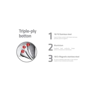 O fundo triplo (aço inox alumínio aço inox) distribui o calor uniformemente, proporcionando um cozimento mais rápido e uniforme, economizando energia e deixando os alimentos aquecidos por mais tempo.