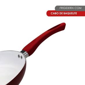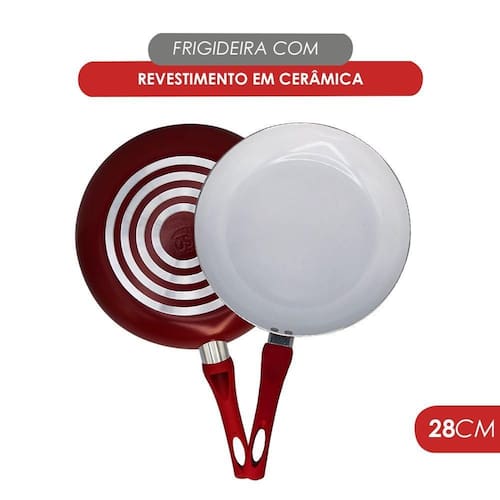 Frigideira com revestimento cerâmico antiaderente e cabo de baquelite 28cm - vermelho Frigideira com revestimento cerâmico antiaderente e cabo de baquelite 28cm - vermelho feita de alumínio com revestimento em cerâmica, resistente a arranhões/manchas e possuindo uma tecnologia antiaderente, essa frigideira vai ser a escolha ideal para sua cozinhapermite o preparo de diversas receitas de forma mais saudável, já que não necessita de muito óleo, além de facilitar no momento da lavagem ao diminuir os resíduos dos alimentos na parte interna do produto.Conta com seu cabo de baquelite revestido em silicone, oferecendo uma boa aderência para manuseio da frigideira, garantindo maior segurança e diminuindo acidentes com queimaduras. Cuidados-não utilize espátulas, colheres, garfos, facas ou outros utensílios metálicos para manusear ou raspar alimentos, podendo causar arranhões e danos severos no revestimento;-escolha a boca da chama do fogão do tamanho adequado para as bases da panela, para que não danifique o cabo;-capacidade máxima de cozimento 2/3 da capacidade total da panela. especificações:material: alumínio e baquelitedimensões: comprimento: 47cm x diâmetro: 28cm x alt.: 5,5cmpeso: aprox. 540gcor: vermelho contém:01 frigideira com revestimento cerâmico antiaderente e cabo de baquelite 28cm - vermelho