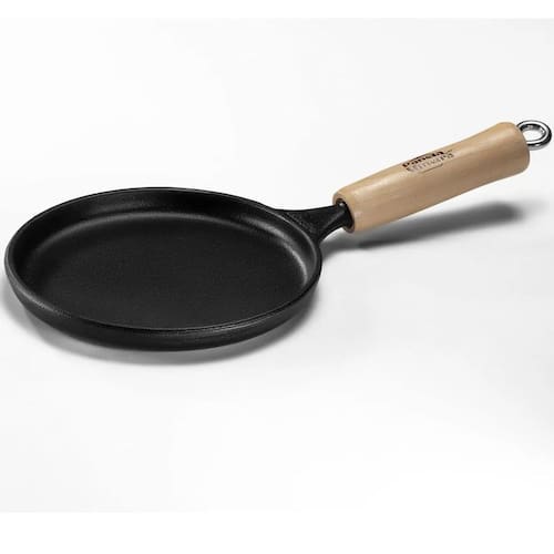 Frigideira fabricada em ferro fundido, indicada para o preparo de tapiocas, ovos, panquecas e pequenas receitas do dia a dia. O material contribui para aquecimento uniforme e boa estabilidade térmica durante o preparo. O cabo em madeira naval auxilia no manuseio.