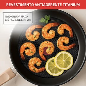 - Revestimento Titanium Reforçado: Não gruda. O revestimento antiaderente Titanium de alta durabilidade facilita tanto o preparo dos alimentos quanto a limpeza, garantindo muito mais praticidade no seu dia a dia.