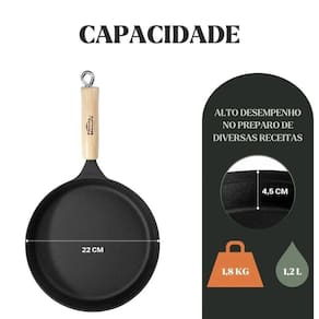 Frigideira Tradição 22 cm 1,2 L em Ferro Fundido e Cabo de Madeira Panela Mineira - Especificações TécnicasDimensões Produto (Compr. X Larg. X Alt.): 22 x 22 x 4,5 cm.