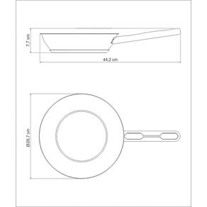 Sempre deixe a frigideira esfriar antes de mergulhar na água. Características GeraisEAN137891116108277DUN1417891116108274NCM7323.93.00Peso Líquido0,8020 kg.Peso Bruto0,9060 kg.Metragem0,009330 m.Dimensões Embalagem (Compr. X Larg. X Alt.)443x 270x 78 mm.Dimensões Produto (Compr. X Larg. X Alt.)442x 267x 77 mm.Diâmetro24,0 cm.Capacidade2,10 l.Espessura0,5 mm.