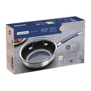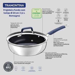 A frigideira funda com tampa Tramontina Romagna com revestimento cerâmico Black Stone é perfeita para quem busca desempenho e praticidade na cozinha. Com 24 centímetros de diâmetro e capacidade de 3,1 litros, ela oferece o espaço ideal para preparar receitas generosas com agilidade. Sua estrutura conta com a Tecnologia Biply Induction, que combina aço inox e alumínio, garantindo um aquecimento rápido e uniforme, além de contribuir para a economia de energia. O revestimento interno cerâmico facilita a limpeza e impede que os alimentos grudem, tornando o preparo mais simples e eficiente. com todos os tipos de fogões, inclusive os de indução, a frigideira ainda possui cabos metálicos com proteção de silicone, que asseguram mais e conforto durante o uso. A tampa de vidro temperado permite acompanhar o cozimento sem abrir, preservando o calor e a umidade dos alimentos. Com a Tramontina, cada detalhe é pensado para deixar sua rotina mais prática e saborosa.