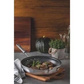 A Frigideira Tramontina Profissional em alumínio com revestimento interno antiaderente Starflon Premium e acabamento externo lixado, com 35 cm de diâmetro e capacidade de 5,6 litros, é ideal para a cozinha do seu restaurante.