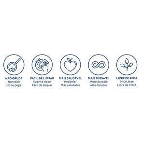 Corpo de alumínio com acabamento externo lixado. Espessura da peça de 3,6 mm: distribuição uniforme do calor. Revestimento interno de antiaderente Starflon T3. O único com a tecnologia T: maior poder de antiaderência; maior resistência à abrasão; maior durabilidade; mais fácil para limpar e livre de PFOA, garantindo uma resistência à abrasão mais de 15.000 ciclos baseado na Norma ABNT NBR 15321:2013. Cabo de aço inox com luva de silicone removível. Maior proteção contra o calor. Sistema de fixação do cabo com 3 rebites. Maior segurança e estabilidade durante o uso. Alça de aço cromado.