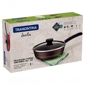 Frigideira Tramontina Sicília Funda Antiaderente 24cm A frigideira funda Tramontina com tampa Sicília em alumínio com revestimento interno e externo em antiaderente Starflon Excellent avelã 24 centímetros de diâmetro 2,5 litros é a escolha ideal para fazer frituras de imersão, como batatas fritas para acompanhar aquele bife delicioso. Desenvolvida com corpo em alumínio com revestimento antiaderente Starflon Excellent, ela propociona o cozimento dos alimentos de maneira rápida e uniforme, além de evitar que eles grudem em sua superfície. Seu cabo é em baquelite antitérmico e proporciona um manuseio muito mais confortável e , pois não aquece. Ela ainda é muito fácil de limpar e pode ser levada à máquina de louças, otimizando suas tarefas na cozinha. Uma frigideira de alta qualidade, durável e não prejudicial a saúde, perfeita para completar sua cozinha! Recomendações de Uso: A capacidade volumétrica máxima para cozimento é de 3/4 da capacidade total da peça.Posicione o cabo do utensílio voltado ao centro do fogã fogões com grade, centralize a peça e alinhe o cabo com a ílios quentes devem estar fora do alcance das crianç produto não pode sofrer modificaçõ do primeiro uso, lave com esponja macia, sabão neutro ou detergente lí de secar, unte a área interna com óleo ou gordura e leve ao fogo por um ou dois minutos. Deixe esfriar e lave utensílio Starflon está pronto para uso com ou sem gordura, sempre em fogo baixo ou médio (nunca superior a 260C).Para mexer os alimentos use somente utensílios de silicone, nylon ou madeira.Limpeza: Evite a imersão do utensílio quente em água utilize produtos abrasivos na deixar queimar alimentos, umedeça a área e reserve até que possa remover os resíduos grudados com esponja e sabã descarte do produto e embalagem siga as orientações de reciclagem produto não necessita de manutenção, apenas limpeza. Informações Adicionais: