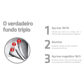- Possui ainda o diferencial de fundo triplo (aço inox + alumínio + aço inox) tecnologia que transmite o calor de forma igual, cozinhando mais rápido e com menos gasto de energia.