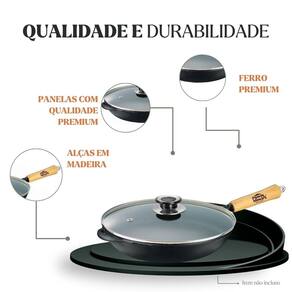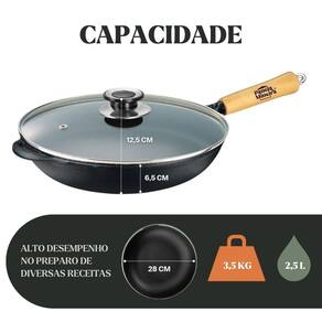 Modelo: Frigideira Wok Cabo de Madeira e Tampa de Vidro 28×12,5cm 3L Material da peça: ferro fundido Material da tampa: vidro temperado Material do cabo: madeira Medidas: 28 × 12,5 cm Altura com tampa: 12,5 cm Altura sem tampa: 6,5 cm Capacidade: 3 L Peso aproximado: 3,665 kg Compatível com fogão: indução, gás, elétrico, vitrocerâmico, lenha, forno Já vai curado. Pronto para uso Revestimento atóxico (camada protetora) Garantia: 90 dias contra defeitos de fabricação Remover peças de madeira antes de levar ao forno