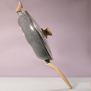 - compatibilidade: fogão à gás, indução, halógeno, elétrico e vitrocerâmico. - linha: marble edition revestimento em biocerâmica. - cor: dark grey acabamento marmorizado. - cabo revestido em silicone na cor madeira. - material: alumínio revestido em cerâmica - tampa de vidro temperado - dimensões: 28 x 53,9 x 10cm; l x c x a - espessura de 5.5mm com fundo de indução - comprimento do cabo: maior 18 cm / menor 7cm - diâmetro: 28cm - peso: 1,35kg