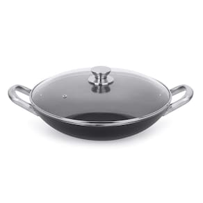 Frigideira Wok 34 Profissional Multiflon com revestimento antiaderente Quartzo. Fabricada em alumínio 2,3mm com asas e pomes de aço inoxidável tubular e tampa de vidro com saída de vapor.