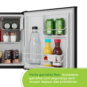Seu interior conta com prateleira removível, porta garrafas flexível e porta-latas, oferecendo organização e segurança para armazenar desde pequenos alimentos até garrafas grandes. O compartimento extra frio é ideal para bebidas que precisam estar trincando.