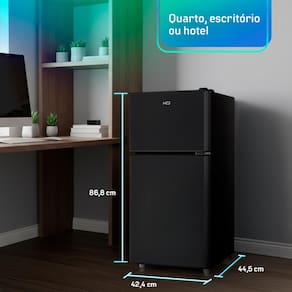 Frigobar Duplex HQ 90 Litros Preto HQ-90RDF com freezer dedicado de 25 L a 18 C e refrigerador de 65 L em duas portas. Possui prateleiras de vidro ajustáveis e gaveta organizadora para frutas/verduras. Iluminação interna, termostato ajustável e condensador interno.Vendido e entregue por Belmicro