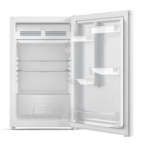 Frigobar com controle de temperatura analógico, capacidade de 122L, porta reversível, gaveta para frutas e legumes, prateleira de vidro, compartimento para garrafas, iluminação LED interior.Características