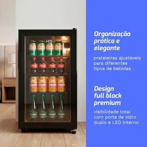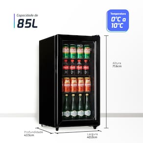 Frigobar expositor vertical com 85 litros de capacidade. Utiliza gás ecológico R600a. Possui prateleiras ajustáveis e porta de vidro. Controle de temperatura com termostato ajustável. Luz interna. Condensador interno. Tampa traseira.Vendido e entregue por ENGAGE ELETRO