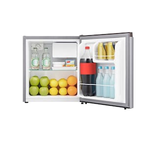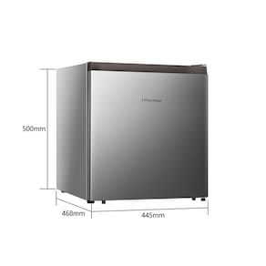 Frigobar Hisense 44 litros prata com dobradiça de porta reversível e pés niveladores ajustáveis. Possui prateleiras de vidro temperado e varanda com porta XXL.Características