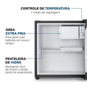 Frigobar com capacidade de 46 litros, porta reversível, 7 níveis de controle de temperatura, área extra fria, prateleira de vidro temperado, distribuição interna inteligente, pés niveladores ajustáveis, gás ecológico R600A e eficiência energética A+.Vendido e entregue por REDE Marketplace
