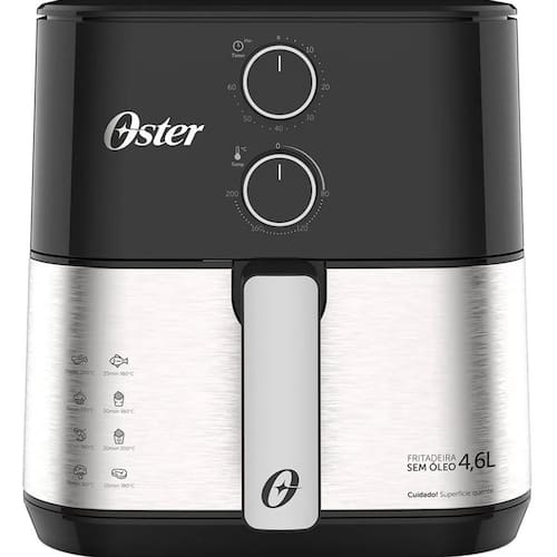 Fritadeira Air Fryer Oster com capacidade de 4,6 litros, timer de 60 minutos, potência de 1500W, temperatura ajustável de 80°C a 200°C, cesto removível com revestimento antiaderente e trava de segurança.Porta-fio