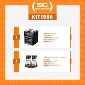 Componentes do kit: - 1 fritadeira sem óleo air fryer oven digital toutch titanium 12l premium eaf12t 127v - eos - 1 jogo moedor de sal e pimenta em cerâmica e vidro com base em silicone linha churrasco - tramontina 26499042