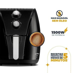 Fritadeira Air Fryer Britânia BAF45A com 1500W, capacidade de 5 litros, cesto removível com revestimento antiaderente, timer de 60 minutos, desligamento automático e ajuste de temperatura de 80°C a 200°C.Porta-fio