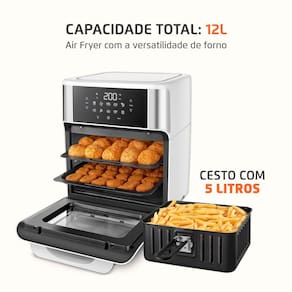 Com capacidade total de 12 litros, o modelo inclui um cesto de 5 litros e três assadeiras antiaderentes, ideais para preparar até três pratos ao mesmo tempo. O controle de temperatura e o timer de 60 minutos ajustáveis permitem elaborar receitas com mais precisão.