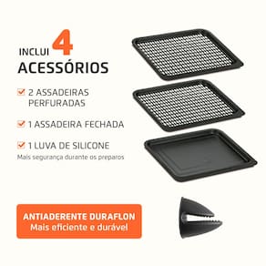 Cesto de 5 Litros + 3 Assadeiras Antiaderentes: O cesto quadrado permite o preparo de alimentos em maior quantidade e as assadeiras são ideais para diferentes receitas. Tudo fácil de usar e limpar.