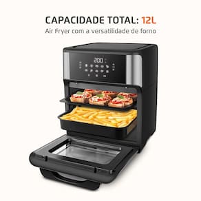 A Air Fryer Forno Mondial AFON-12L-BIN combina a praticidade da fritadeira a ar com a versatilidade de um forno, permitindo assar, cozinhar e fritar refeições mais saudáveis, sem abrir mão do sabor. Com 12 litros de capacidade, acompanha cesto bandeja com puxador e duas assadeiras antiaderentes, ideais para preparar até três receitas ao mesmo tempo, com mais agilidade no dia a dia e limpeza facilitada.