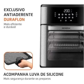 A Fritadeira Air Fryer Forno Oven Mondial AFON-12L-BG é um eletrodoméstico 2 em 1 que combina as funções de air fryer e forno, oferecendo mais versatilidade no preparo de diversos alimentos. Com capacidade total de 12 litros, permite preparar grandes porções e até diferentes receitas ao mesmo tempo.