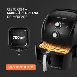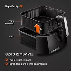 Características Gerais do produto Fritadeira Air Fryer Mondial 8L, 1900W, cesto remetrosovível cometros antiaderente Duraflon, controle analógico de temetrosperatura.