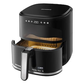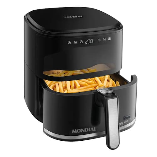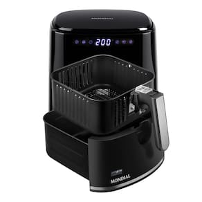 Painel digital touch, visor frontal transparente com iluminação interna, design em inox, cesto quadrado, cesto removível com revestimento antiaderente Duraflon, circulação de ar quente, aviso sonoro e desligamento automático.Porta-fio