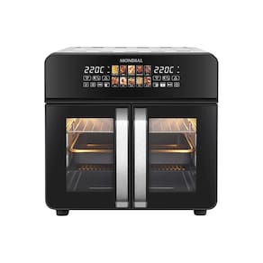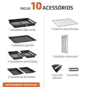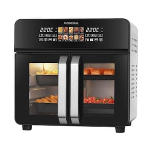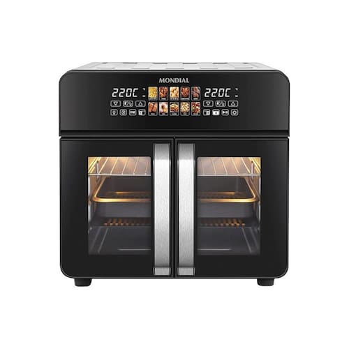 Painel touch colorido com 10 funções pré-programadas, divisória Dualzone removível, função Sincronizar, porta French Door com vidro duplo, iluminação interna, timer de 90 minutos, controle de temperatura até 220°C, desligamento automático com sinal sonoro.Desligamento automático