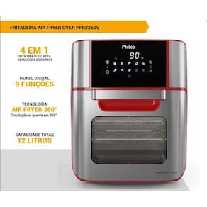 Fritadeira air fryer oven philco 12l 1800w pfr2250v - 220v potência: 1800w - maior potência para um preparo mais rápido e eficientecapacidade total da air fryer 12l - compacta por fora e grande espaço interno, aumentando a quantidade de alimentos a serem preparados por vez. Características:ean: 7899963913969marca: philcomodelo: pfr2250vcor: vermelho e inoxvoltagem: 220vpotência: 1800wcapacidade: 12 litros9 funções: painel digitaltecnologia air fry 360timer de 90 minutosfunção desidratar e reaquecerporta com visor transparenteseletor de temperatura: de 80 a 200cacompanha acessórios: 2 assadeiras removíveis em aço inox, cesto antiaderente com capacidade para 3,5 litros e coletor de gordura e migalhas dimensões da embalagem:altura: 42cmlargura: 38cmprofundidade: 38cmpeso: 8,200kggarantia: 12 meses Ean: 7899963913969