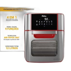 Fritadeira Air Fryer Oven Philco PFR2250V 4 em 1: assa, frita, desidrata e reaquece. Painel Digital com botões touch e acabamento em inox. 1800W de potência. Seletor de temperatura de 80 a 200C. 9 funções pré-definidas. Capacidade total de 12 litros. Função Desidratar. Luz interna. Proteção contra superaquecimento.Porta-fio