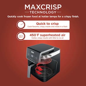 - Tecnologia Max CrISP: o ar superaquecido de 232 °C envolve os alimentos para resultados mais quentes e crocantes com pouco ou nenhum óleo.