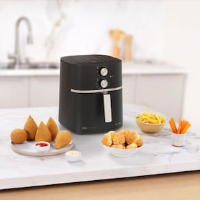A Fritadeira Airfry tem a capacidade generosa de 7,1 litros, e vem equipada com um cesto e grelha removíveis. Com a tecnologia de circulação de ar em 360° , deixando-o crocante por fora e macio por dentro, além de eliminar o óleo em excesso. Seu timer de 60 minutos acompanhado por um aviso sonoro. Além disso, a amplitude de temperatura de 80°C a 200°C.
