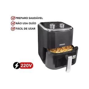 Fritadeira elétrica sem óleo com capacidade de 5 litros, potência de 1350W, temperatura ajustável de 80°C a 200°C, timer de até 60 minutos, visor com iluminação LED, cesto removível com revestimento antiaderente e gaveta com trava de segurança.Porta-fio