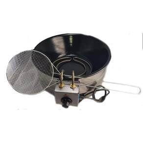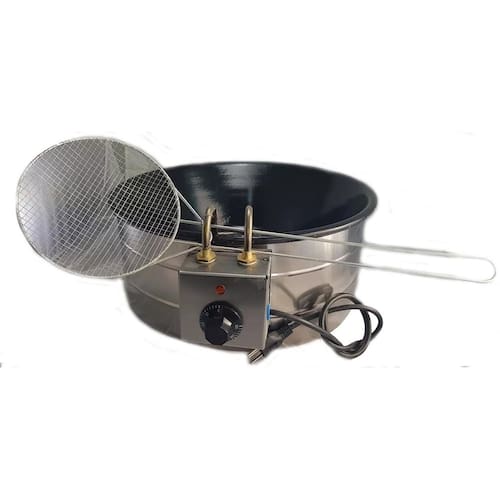 Fritadeira grande com arco em aço inox. Capacidade para 7 litros de óleo. Acompanha Escumadeira de arame industrial estanhado para fritura de 20cm de diâmetro Termostato de 0 a 300º com regulagem e com seletor alfanumérico. Resistência elétrica em tubo inoxidável. Consumo médio. 3kwh no 220v e 2,5kwh no 127v Tacho esmaltado Preto Lâmpada piloto para indicar quando esta ligada a resistência. Própria para pastel, salgados e outros tipos de frituras. Linha industrial e residencial. Medidas: Altura 19cm, profundidade 16cm, diâmetro 44cm. Potência: em 127v - 2500W e em 220v - 3000W Minimo de óleo: 4 litros Ela possui garantia de 90 dias Ean: 7909463590093