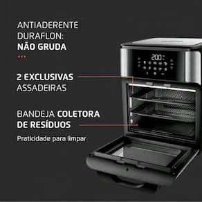A Fritadeira Elétrica Forno Oven 12L Mondial conta com controle de temperatura que proporciona a escolha de temperatura ideal para diferentes tipos de alimentos. Contém timer de 90min que desliga automaticamente ao término do preparo e painel digital com 10 funções pré-definidas. Prepara: Batata, frango, carne, peixe, camarão, pão de queijo, pizza, bolo, legumes e tem a função reaquecer. Inclui bandeja coletora de resíduos, gerando praticidade ao limpar. Cesto de 5 litros, mais facilidade para servir as porções. Com aberturas laterais, melhora o fluxo de ar e assa por igual. Assadeiras com revestimento antiaderente, ideal para preparar pão de queijo, nuggets, pizza e muito mais.